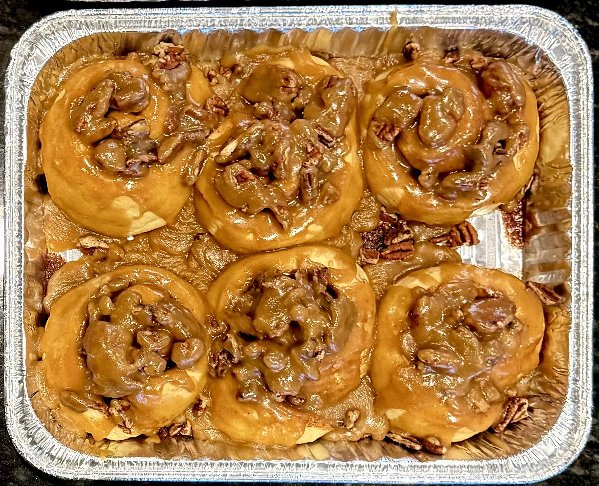 What’s better than one of our delicious cinnamon rolls? Why a delicious cinnamon roll with scratch-made caramel and roasted pecans on top of course. The rich and nutty flavors go well with the soft and luscious caramel. These rolls make for a decadent dessert!